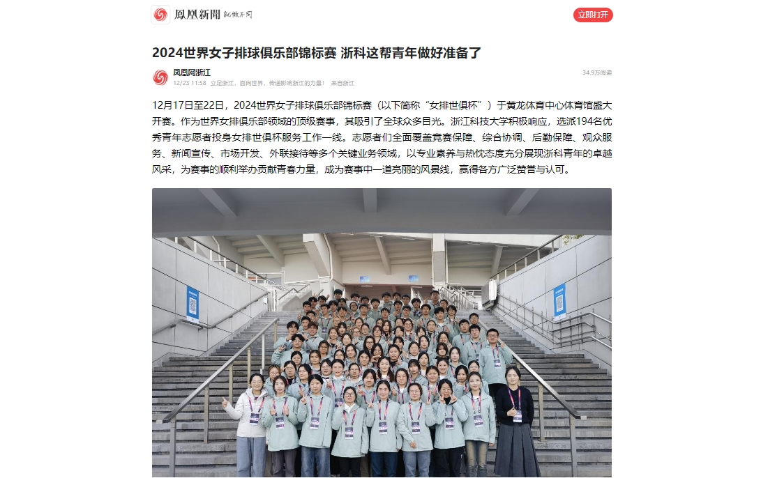 12 月 17 日至 22 日,2024 世界女子排球俱乐部锦标赛(以下简称“女排世俱杯”)于浙江省黄龙体育中心体育馆盛大开赛,学校选派 194 名优秀青年志愿者投身服务工作一线,覆盖竞赛保障、综合协调、观众服务、新闻宣传、市场开发、外联接待等多个关键业务领域,以专业素养与热忱态度充分展现浙科青年的卓越风采,为赛事的顺利举办贡献青春力量,成为赛事中一道亮丽的风景线,受到了人民政协报客户端、凤凰新闻客户端等媒体的关注。