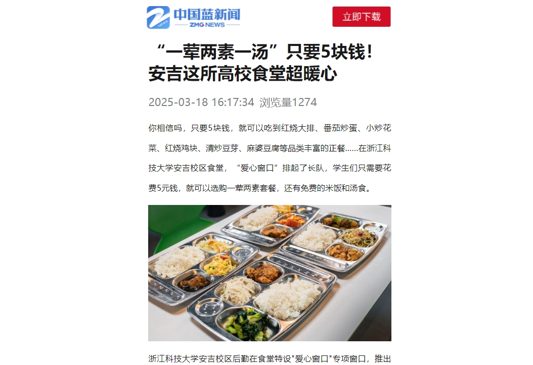 中国蓝新闻客户端:“一荤两素一汤”只要5块钱!安吉这所高校食堂超暖心