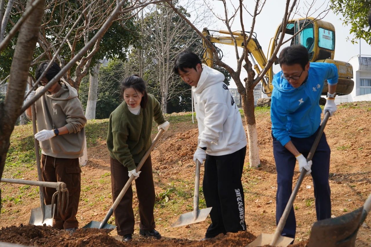 植树现场一派热火朝天,师生们挥锄挖土、扶苗培土、拎桶浇水,合力为校园添新绿。新种下的樱花树、月季、金钱松、紫薇树等,迎风挺立,勾勒校园生态新图景。