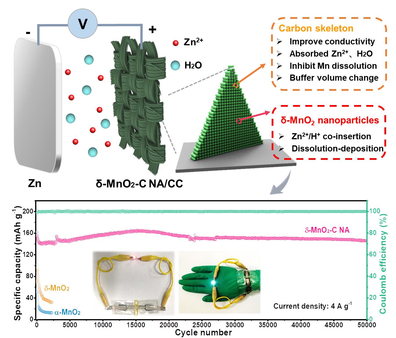 (δ-MnO2-C NA/CC电极结构优势示意图、循环性能图及点亮LED灯照片)