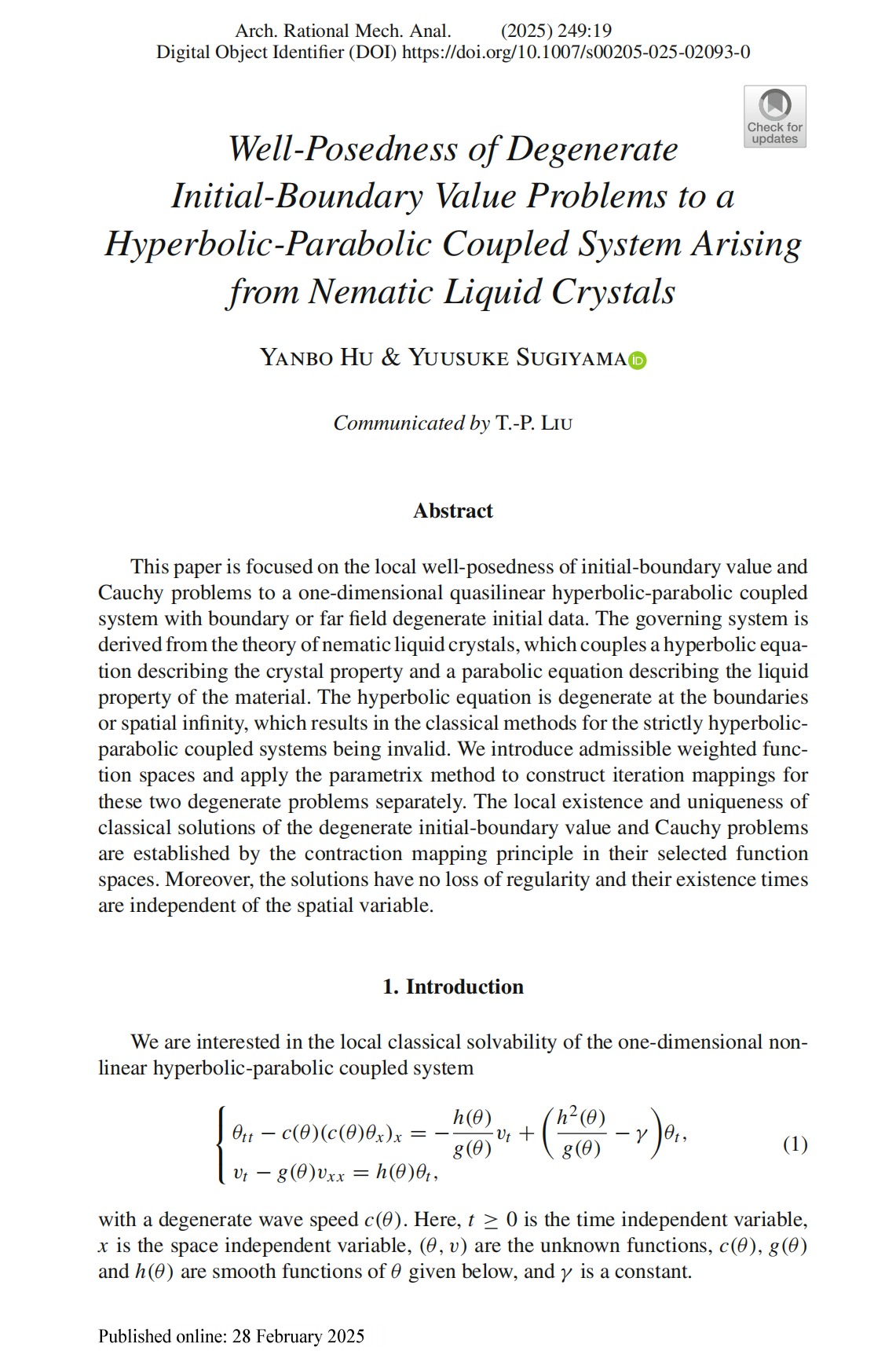 近日,非线性偏微分方程团队胡燕波教授与日本滋贺县立大学Yuusuke Sugiyama教授合作,在《Archive for Rational Mechanics and Analysis》(理性力学与分析档案,简称ARMA)上发表长达66页的论文。这篇题为“Well-Posedness of degenerate initial-boundary value problems to a hyperbolic-parabolic coupled system arising from nematic liquid crystals”(点击阅读)的研究论文,理学院胡燕波教授为第一作者,久久精品一区二区|久久久一区二区三区|欧美日韩视频|欧美福利视频|高清欧美性猛交xxxx黑人猛交|久久久www成人免费精品|在线观看成人网站为第一完成单位。