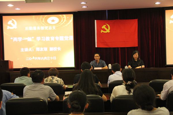 6月30日下午,在党的95岁生日来临之际,后勤服务部党总支在学校行政楼328会议室举办了“两学一做”学习教育专题党课暨纪念建党95周年学习会。本次专题党课以“迎七一、话党建、树标杆”为主题,特邀分管校领导郑友取副校长作“两学一做”学习教育专题党课宣讲。会议由后勤服务部党总支书记王静主持。后勤服务部各中心(部、室)副主任以上人员、全体党员及入党积极分子代表共计40余人参加了此次会议。此外,校资产处、国际处、留管中心三个党支部的全体党员也一起参加了会议,作为联合党课,资源共享,也是“两学一做”学习教育的创新实践。