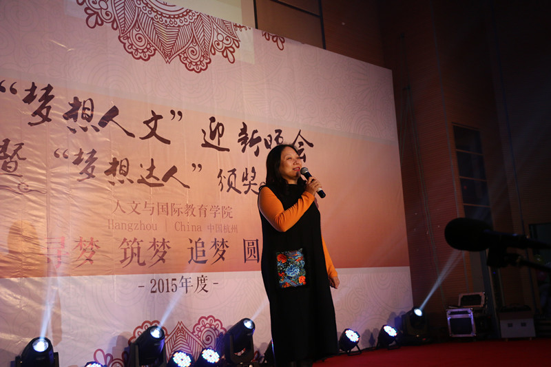 颁奖典礼上,人文与国际教育学院党总支书记叶晗老师发表讲话:“你来浙科院干什么,你要成为什么样的人?”叶晗老师现身说法,用自己的经历来引起大家对选择中文的思考,并强调“要成为什么样的人”的意志的重要性。继而,叶晗老师讲述了学院从中英教育到国际教育,从通识教育到精英教育的发展历程。叶晗老师对本次颁奖典礼寻梦、筑梦、追梦、圆梦四个篇章做了介绍,并鼓励大家坚持梦想,提出了“梦想人文,有你有我;汉语国际,强院强国!”的口号。